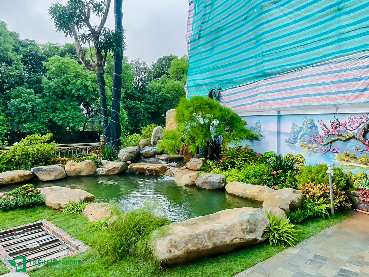 Thay vì một khoảng sân đơn điệu, toàn bộ khuôn viên quanh biệt thự đã được Triệu Điền “thổi hồn” bằng một thiết kế sân vườn mới. Từ mặt tiền đến khoảng sân sau, từng góc đều mang hơi thở thiên nhiên: hồ cá Koi trong veo, vườn hoa rực rỡ sắc màu, những hàng cây xanh mát và mái chòi nghệ thuật mang dáng dấp cổ điển. Tất cả hòa quyện, tạo nên một không gian sống đẳng cấp – nơi gia chủ có thể thư giãn, tiếp khách và tận hưởng sự an yên ngay trong chính ngôi nhà của mình.