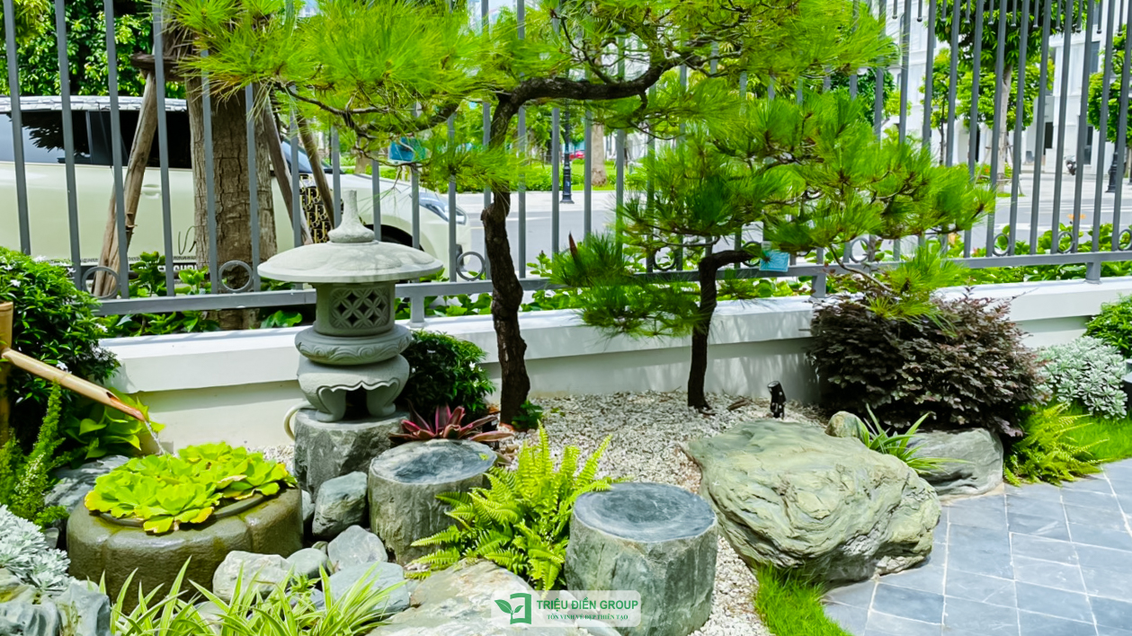 – Tiểu cảnh sỏi đá kết hợp cùng bonsai nghệ thuật và cây tán nhỏ, giúp khu vườn thêm sinh động, giàu sức sống.