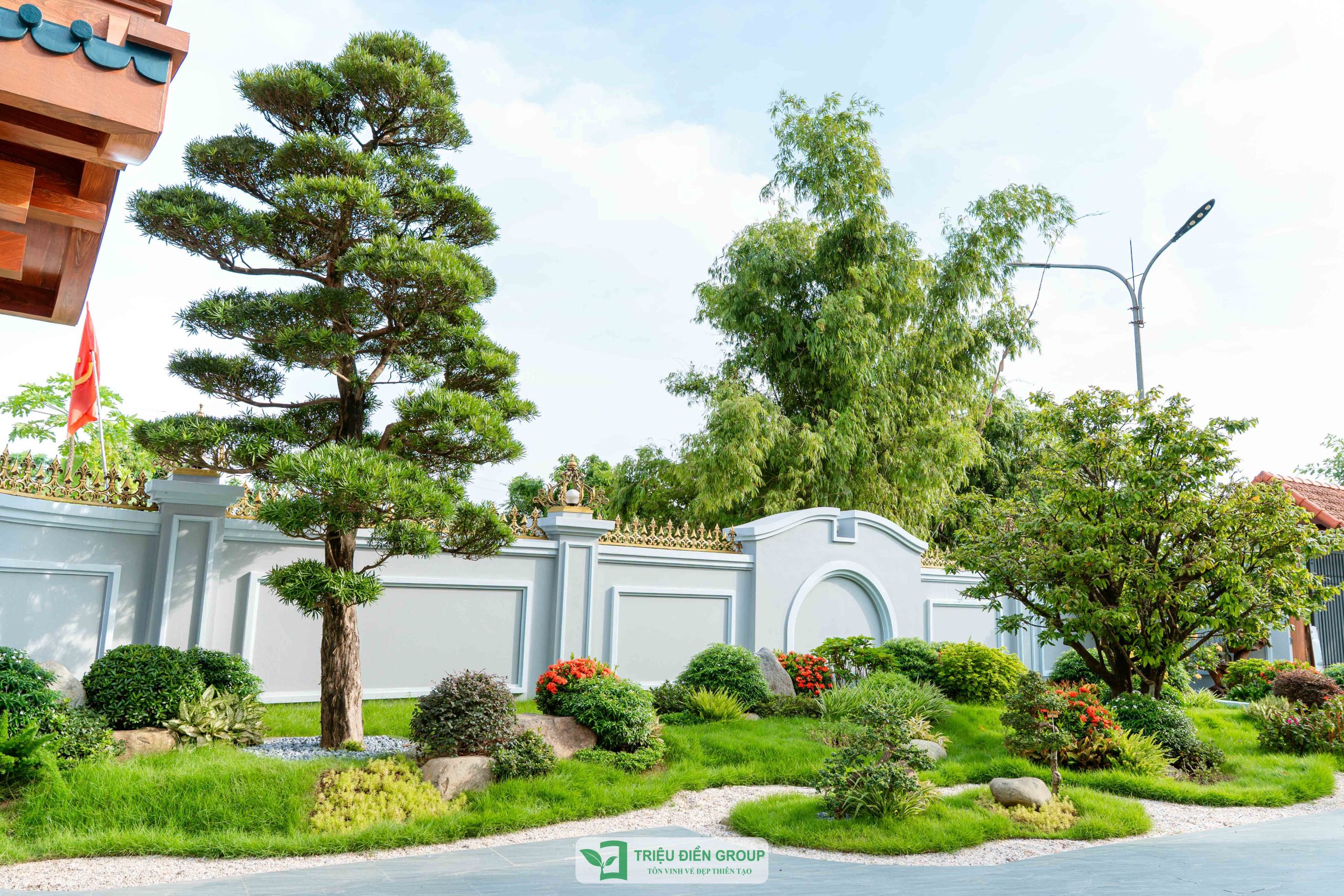 Trong dự án này, các cây tùng tạo thế, thông Nhật được lựa chọn làm trục chính, đóng vai trò định hình thần thái và tạo cảm giác ổn định cho không gian. Xen kẽ trong tổng thể là hệ cây hoa và cây bụi hoa theo mùa, giúp cảnh quan luôn có sức sống và sắc độ nhẹ nhàng, phù hợp với không khí tĩnh tại của khuôn viên: