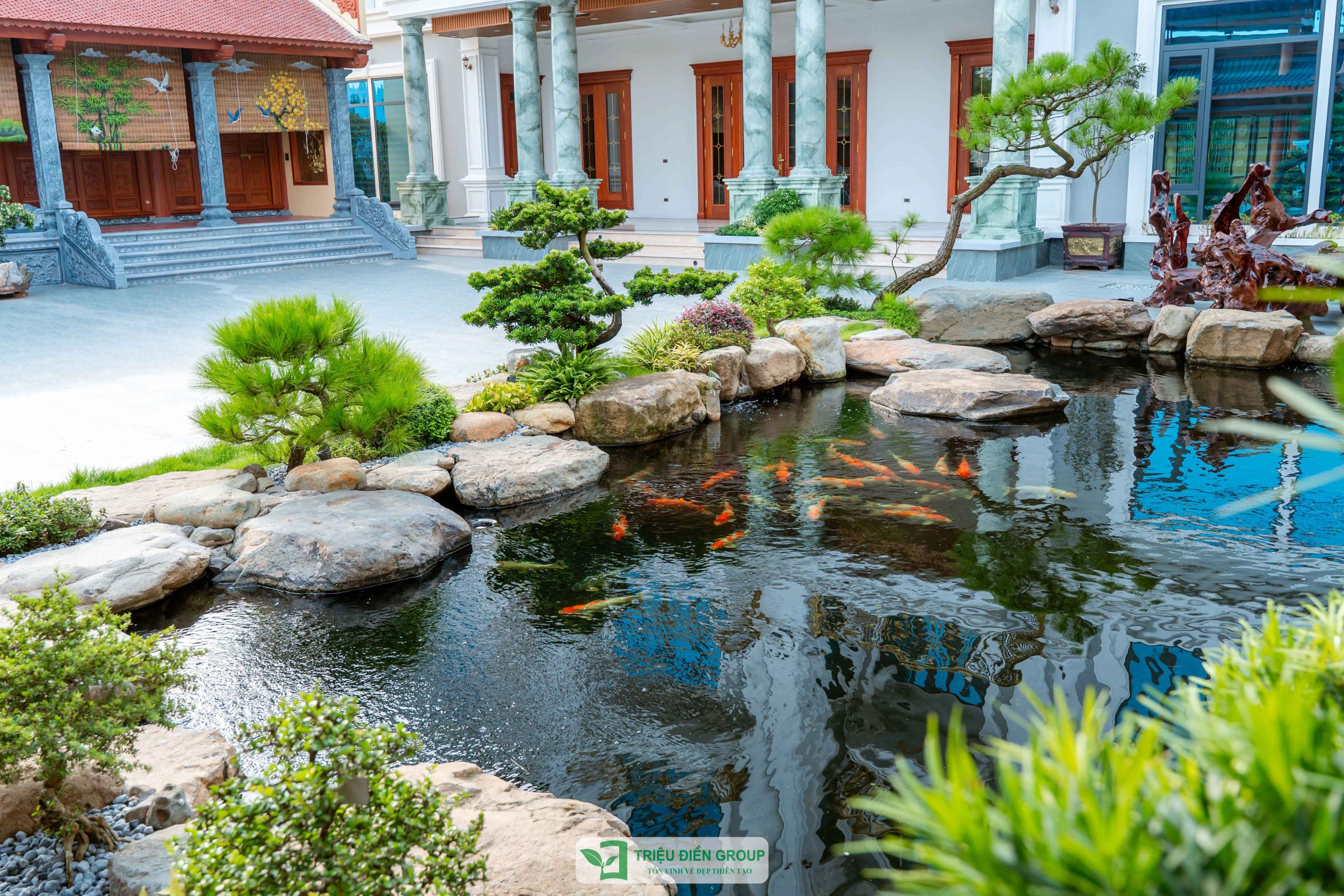 Tại Hà Nam, khuôn viên cảnh quan sân vườn nhà thờ được Triệu Điền Group thiết kế và thi công theo định hướng trang nghiêm, chuẩn mực và giàu chiều sâu thẩm mỹ. Toàn bộ không gian là sự kết hợp hài hòa giữa cây xanh tạo thế, hồ cá koi, đá tự nhiên và kiến trúc gỗ truyền thống, góp phần nâng đỡ giá trị tâm linh và tạo nên bầu không khí an yên cho khu vực thờ tự.